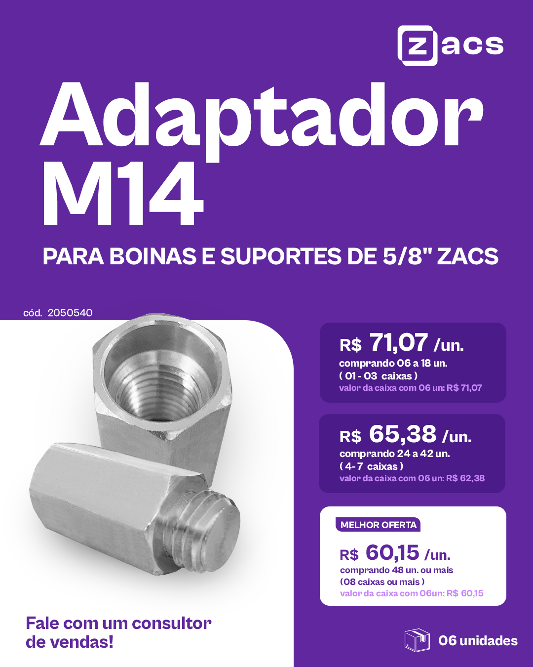 O ADAPTADOR M14 PARA BOINAS E SUPORTES DE 5/8″ ZACS foi desenvolvido exclusivamente para uso em politriz rotativa e esmerilhadeiras que possuem padrão de rosca M14. Fabricado em alumínio, é leve, prático e usinado em máquina CNC, garantindo um perfeito balanceamento para polimentos em geral.