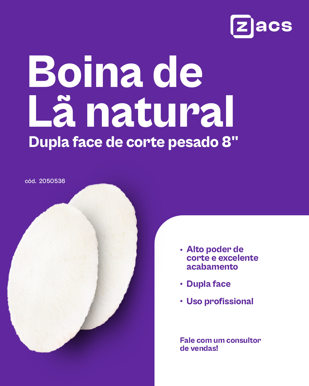 A BOINA DE LÃ NATURAL dupla face de corte pesado ZACS 8′, de uso profissional, apresenta excelente poder de corte com ótimo nível de acabamento. Pode ser utilizada em ambos os lados. Proporciona acabamento brilhante com baixa apresentação de hologramas.