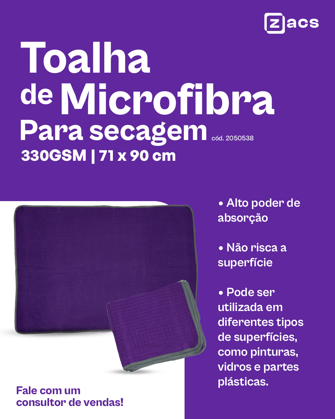 Desenvolvida em microfibra macia de alta qualidade que possui alto poder de absorção de líquidos. É indicada para secagem de veículos em geral com pinturas, vidros, partes plásticas etc.