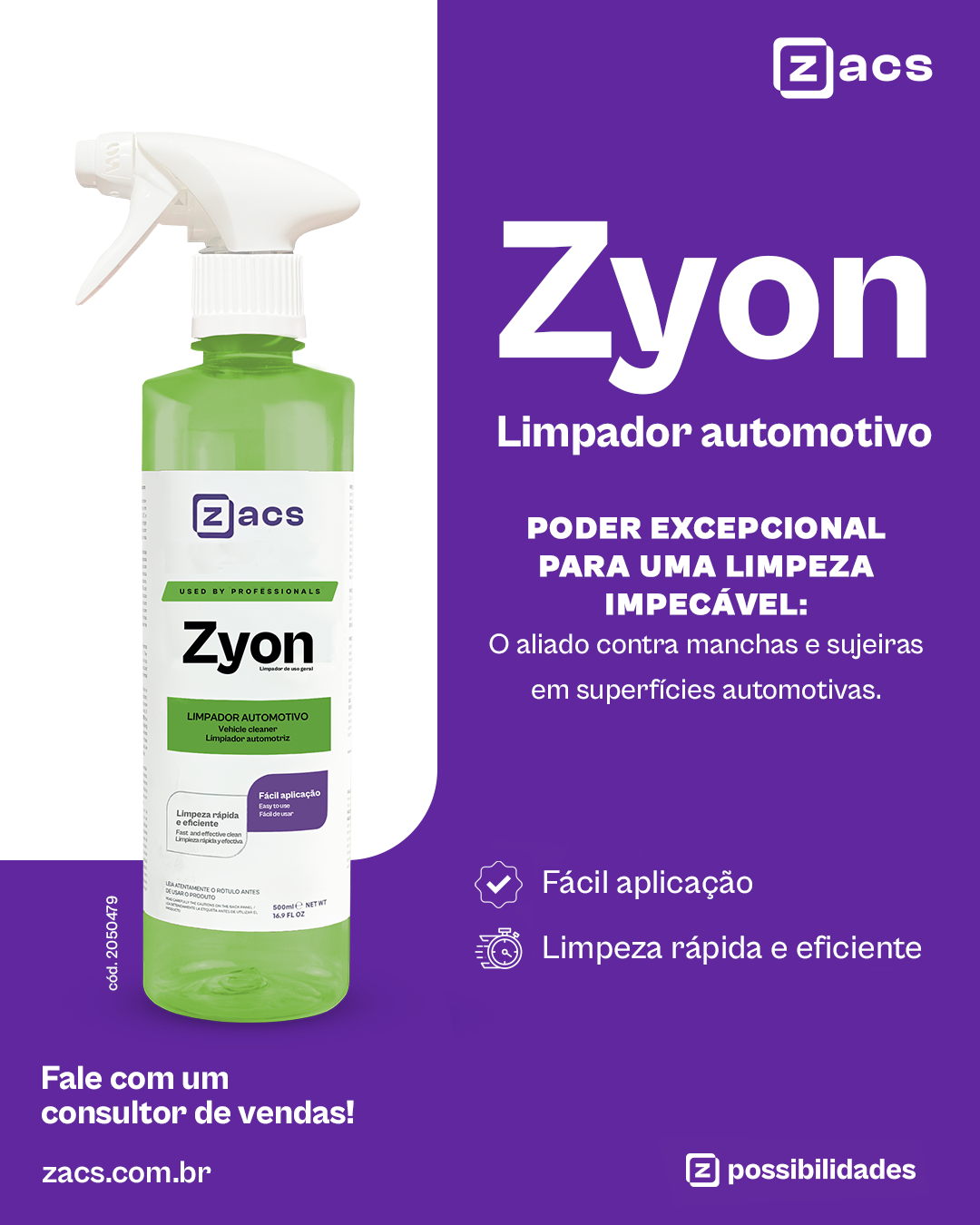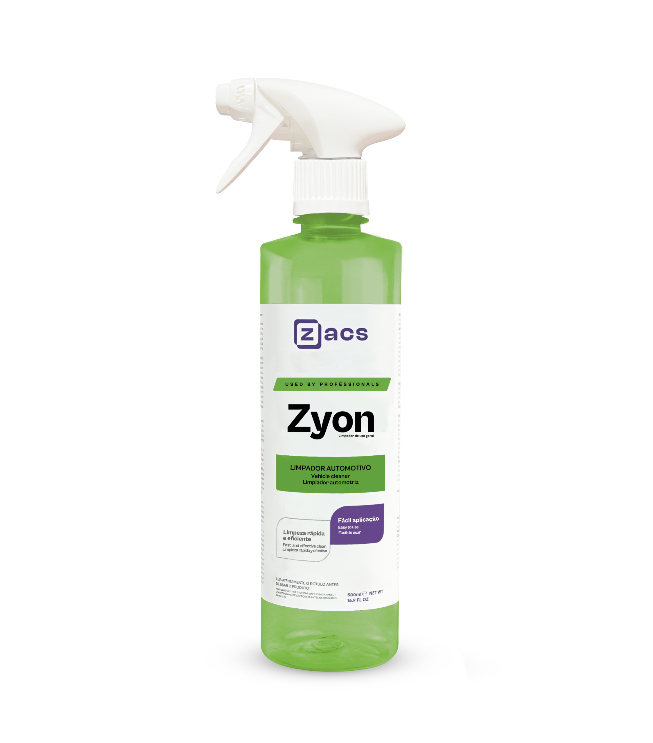 ZYON é um limpador pronto para uso, de alta performance, formulado para limpar superfícies veiculares, tais como: plásticos,